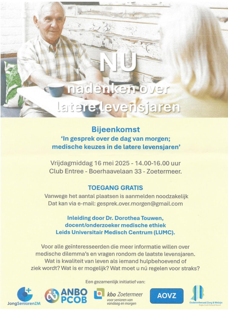 - Thema: “In gesprek over de dag van morgen; medische keuzes in de latere levensjaren”.